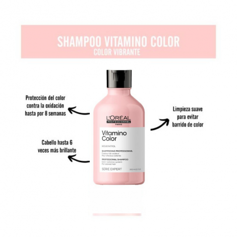 Pack Vitamino color Loreal professionnel de la serie Expert, cuida y resalta tu coloración, enriquecido con Resveratrol, un poderoso complejo antioxidante, aporta tonos vibrantes y un brillo infinito al cabello.
