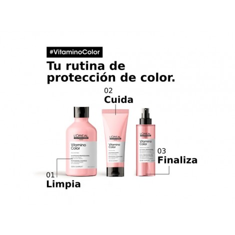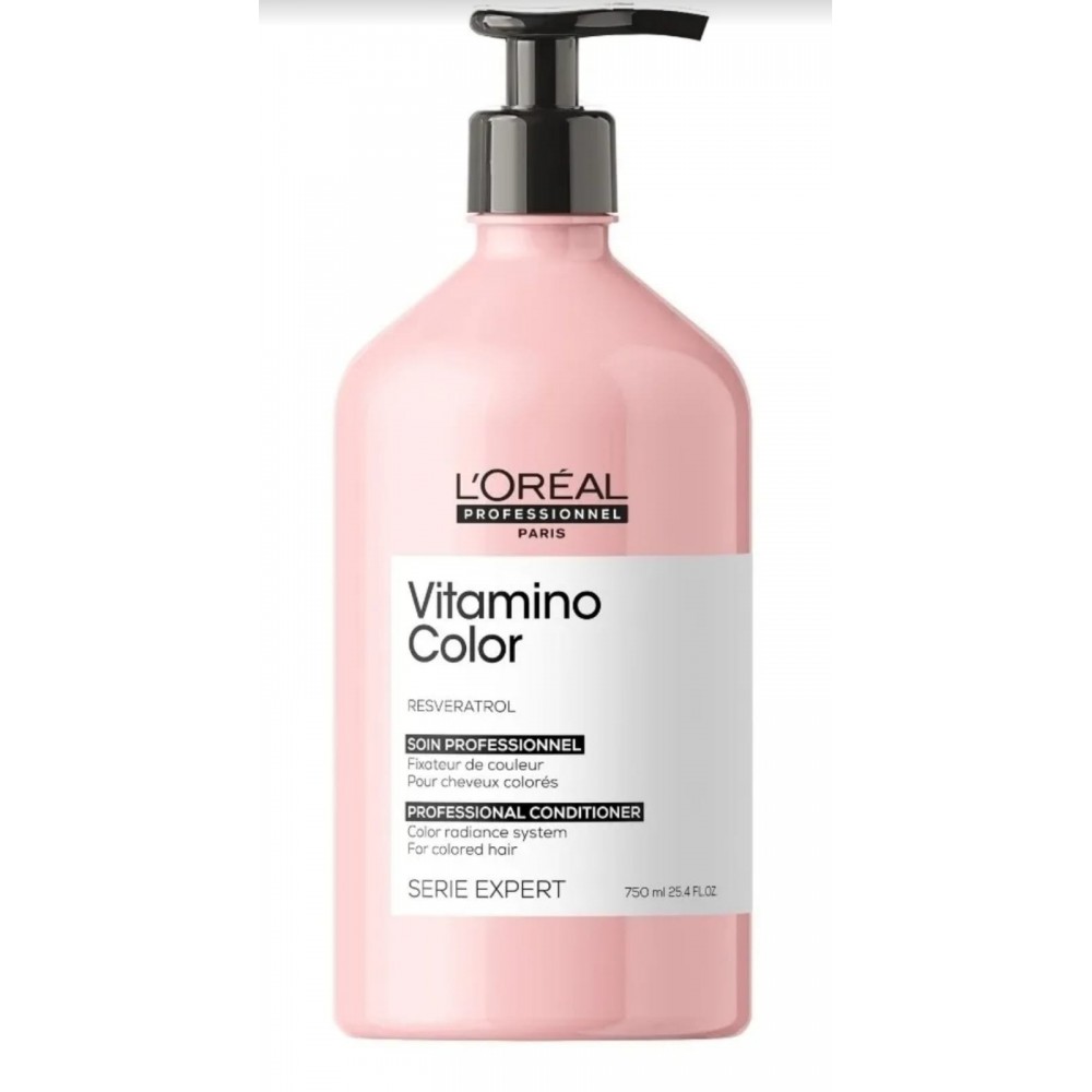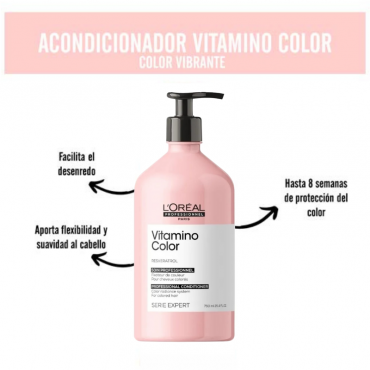 Acondicionador Vitamino Color Loreal Professinnel de la serie expert,Aporta tonos vibrantes, elaborado con resveratrol, protege el color contra la perdida del color y decoloración hasta por 8 semanas, y a la fibra contra los daños. El cabello es más resistente, hidratado, más fácil de desenredar y más suave.