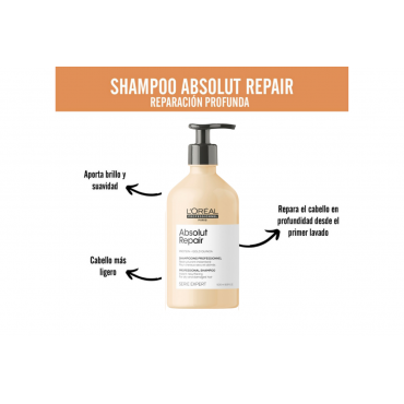 El Shampoo Absolut Repair Loreal Professionnel de la serie Expert, repara y fortalece las áreas más dañadas del cabello. El cabello queda instantáneamente reconstruido y transformado desde el interior, dejando tu pelo dañado con un aspecto sano, con brillo y una suavidad increíble.