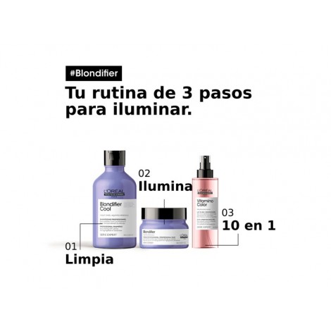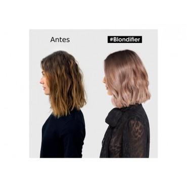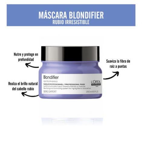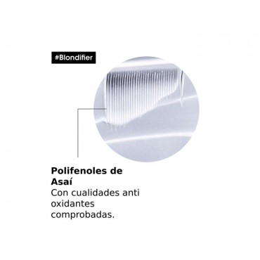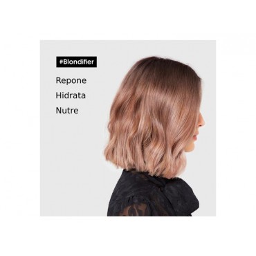 Máscara Blondifier de Loreal Professionnel de la Serie Expert, nutre, ilumina y aporta brillo instantáneamente al cabello rubio sensibilizado. Enriquecida con Moras de Acai, cerámicas y vitamina E. Aporta intensa suavidad e hidratación.