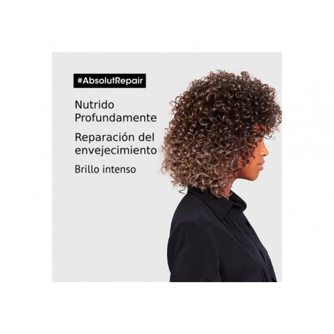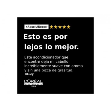 Acondicionador Absolut Repair Loreal Professionnel de la serie Expert, ideal para cabello muy dañado o debilitado, su fórmula profesional nutre y repara instantáneamente el cabello dañado, fortaleciendo el pelo visiblemente, el cabello queda más brillante, suave, resistente y la superficie del cabello está menos dañada.